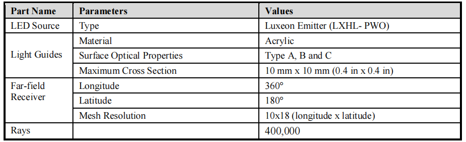 Table 1: The light guide physical model parameters in LightTools.