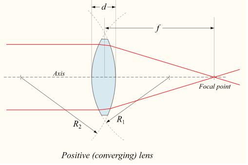 Lenses are classified by the curvature of the two optical surfaces. A lens is biconvex (or double convex, or just convex) if both surfaces are convex. If both surfaces have the same radius of curvature, the lens is equiconvex. A lens with two concave surfaces is biconcave (or just concave). If one of the surfaces is flat, the lens is plano-convex or plano-concave depending on the curvature of the other surface. A lens with one convex and one concave side is convex-concave or meniscus. It is this type of lens that is most commonly used in corrective lenses, since its shape minimizes some aberrations. If the lens is biconvex or plano-convex, a collimated beam of light passing through the lens converges to a spot (a focus) behind the lens. In this case, the lens is called a positive or converging lens. For a thin lens in air, the distance from the lens to the spot is the focal length of the lens, which is commonly represented by f in diagrams and equations. An extended hemispherical lens is a special type of plano-convex lens, in which the lens's curved surface is a full hemisphere and the lens is much thicker than the radius of curvature.